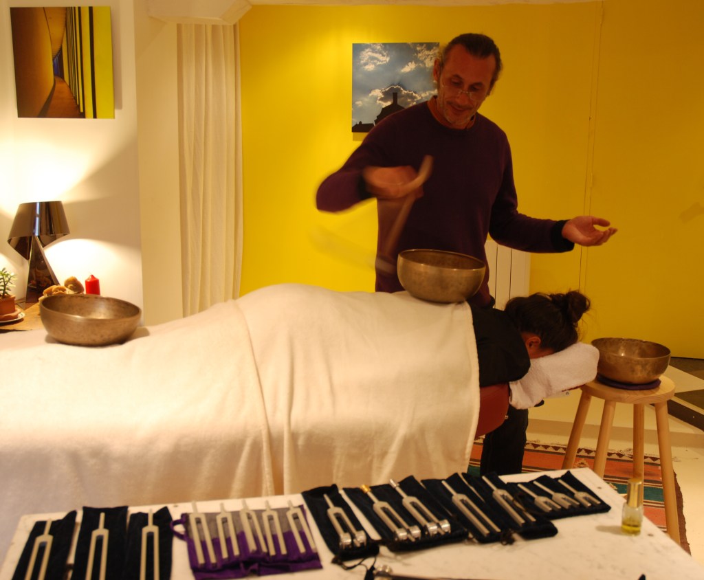 L’utilisation de diapasons thérapeutiques, de bols tibétains, du chant harmonique et/ou du tambour permet d’induire des fréquences, des vibrations universelles équilibrantes et harmonieuses.